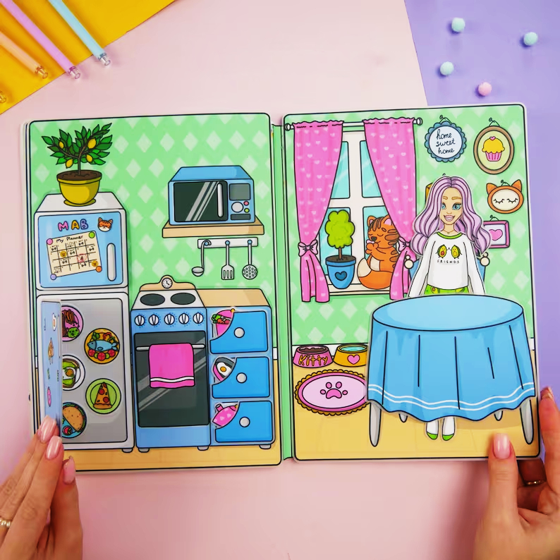 Livro Casa de Bonecas de Papel para crianças. Perfeito para crianças que gostam de brincar de faz de conta, preparar refeições imaginárias, contar histórias, narrar, contos de fadas, vestir bonecas de papel e assim por diante.