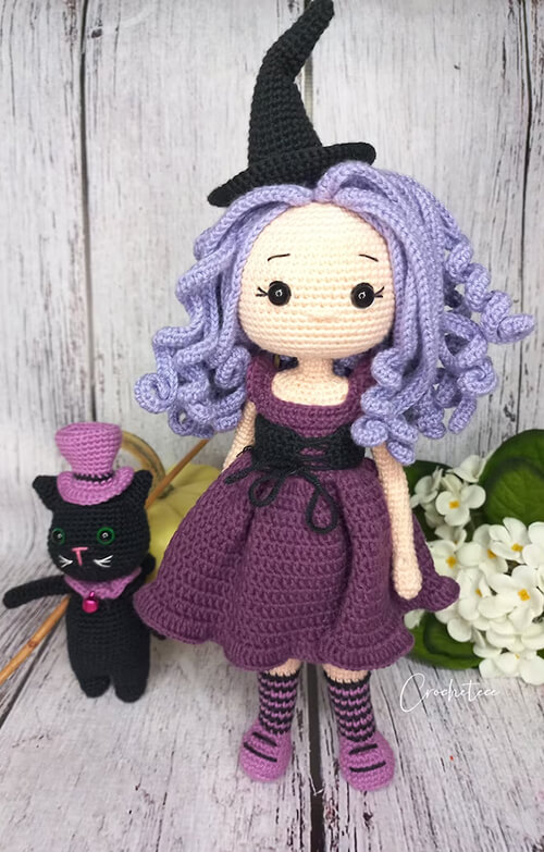 Por enquanto fiz a bruxinha e o gatinho e ficaram lindos e só a cor do cabelo que mudei para cinza
