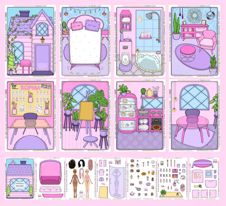 22 páginas A4 com moldes da casa, móveis e bonequinhas.