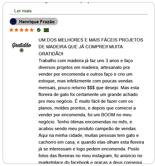 Trabalho com madeira já faz uns 3 anos e faço diversos projetos em madeira, artesanato pra vender por encomenda e outros faço e crio um estoque, mas infelizmente com poucas vendas mensais, pouco retorno $$$ que desejo. Mas esta floreira de gato foi certamente um grande achado pro meu negócio. É muito fácil de fazer com os planos, moldes prontos, e depois que comecei a vender por encomenda, foi um BOOM no meu negócio. Tenho ótimas encomendas no mês, e acabou sendo meu produto campeão de vendas. Aqui na minha cidade, muitas pessoas tem gato e cachorro em casa, e quando elas olham esta floreira já se interessam e logo pedem encomenda. Posto fotos das floreiras no meu instagram, fiz anúncio no marketplace do facebook e graças a deus consegui ter encomendas e pra mim está sendo excelente. Agora desejo ter outros animais floreiras para acrescentar aos produtos que vendo. Pra quem gosta e sabe trabalhar com madeira e tem vontade de ser empreendedor e quer fazer uma grana extra, eu recomendo. Ficar parado, sem atitude, perdendo tempo com besteira, está perdendo dinheiro. Nada vem de graça! Tem que entrar no campo de batalha, estudar, ser criativo e persistir até conseguir o que quer. Torço pra que outras pessoas consigam também! Agradeço a pessoa, ao artista que criou estes projetos. Muita Gratidão!